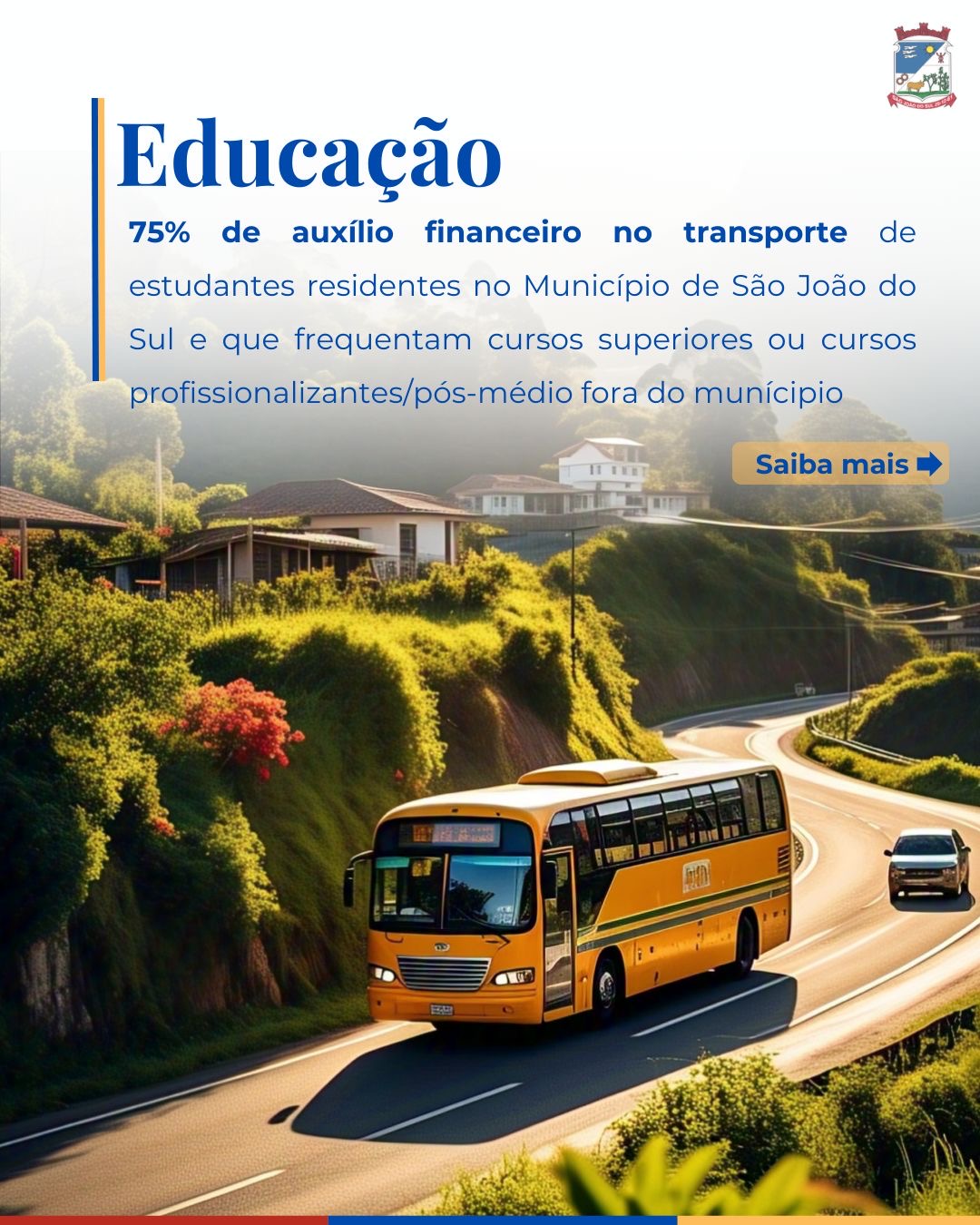 De acordo com o Decreto Municipal nº 007/2025, estudantes residentes no município que frequentam cursos superiores ou profissionalizantes/pós-médio fora do município poderão receber 75% de auxílio financeiro para despesas com transporte escolar.