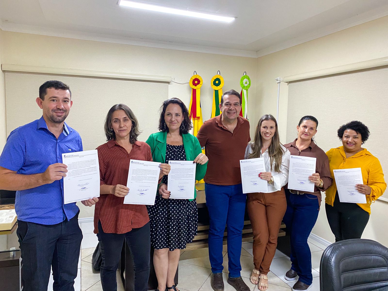 Na última quinta-feira, dia 17, o prefeito de São João do Sul, Alex Bianchin, recepcionou, em ato formal realizado em seu gabinete, os novos servidores públicos empossados, todos destinados à Secretaria Municipal de Educação. Estiveram presentes professores, uma psicóloga e uma monitora de transporte escolar, todos aprovados no último concurso público realizado pelo município.