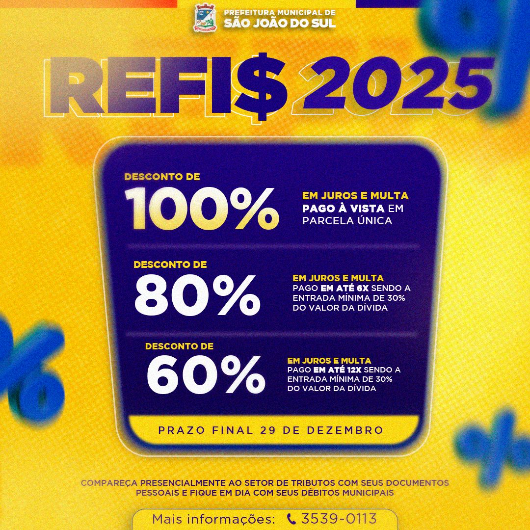 A Prefeitura Municipal de São João do Sul está com o Programa de Recuperação Fiscal – REFIS 2025 em andamento. A iniciativa oferece condições especiais para que os contribuintes regularizem seus débitos municipais com descontos em juros e multas.